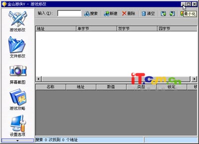 金山游侠V的安装很简单,运行安装程序Setup.exe后一路点击“下一步”重新启动电脑后即可。安装完成后,双击桌面上的金山游侠V图标即可运行(如图1)。从图中可以看出,金山游侠的主界面主要由左右两大部分组成。左边是“游戏修改”、“文件修改”等功能选择区;右边的上部是针对游戏或文件的操作按钮,中部是地址列表及结果显示,下部是状态栏。单击“最小化”按钮将其缩小到任务栏中。