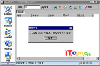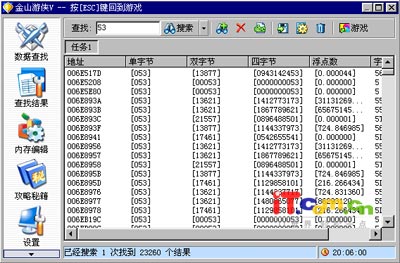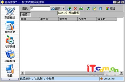 2、按小键盘上的*键呼叫出金山游侠,这时会在游戏界面中弹出金山游侠修改界面(如图3)。在“查找”框中输入当前体力值53,并单击“搜索”按钮或按回车键开始搜索。