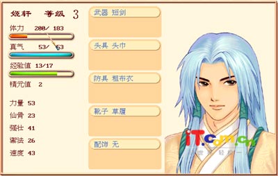 1、运行并开始玩“幻想三国志”游戏。找到游戏中需要修改的数值,如图2所示。这是游戏中某一个主人公的特性。其中体力值用53/183表示,也就是最大体力值为183,当前体力值为53。现在我们要将当前体力值53修改一下。
