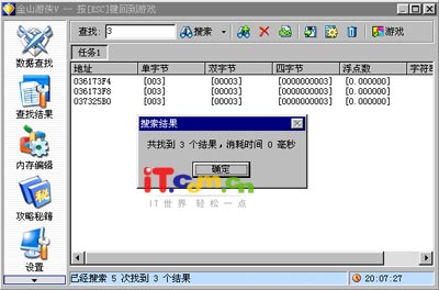 4、点击“确定”按钮,可看到搜索到的所有的地址都会显示在地址列表中(如图5),而我们所要修改的数据就在这里面。但是数据太多了,哪一个才是我们想要的呢?不要着急,接着来。点击工具栏最右边的“返回游戏”按钮或直接按Esc键,返回到游戏中。