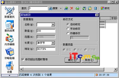 6、双击找到的地址,在弹出的“添加修改”对话框(如图7)中将数值改为你想将体力值改成的数值,比如改为200。修改方式中选择“自动锁定”,这样无论主人公被杀一刀或者得到体力值,体力值都不会改变。如果选择“手动修改”,则此时的体力值为200,以后还会再变的。