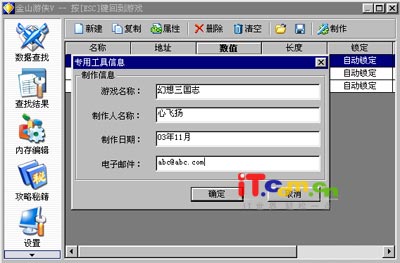 点击图9工具栏上的“制作”按钮,在弹出的对话框中(如图10)输入相关制作信息,点击“确定”按钮,即可把当前列表中的所有数据制作成当前游戏的专用游戏修改器,这样下次无需启动金山游侠就可以直接对当前游戏进行修改了。