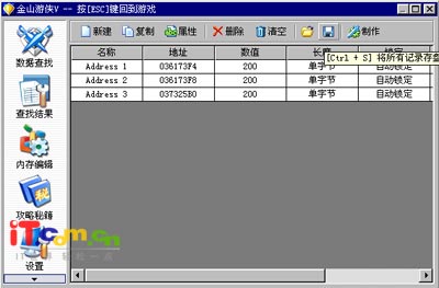 以上的游戏修改只能对当次的游戏起作用,我们可以将所有搜索到并修改后的数据进行存盘,以便下次再玩游戏时直接调用。点击图6中左边的“查找结果”按钮,在如图9所示的查找结果界面中点击工具栏中的“将所有记录存盘”按钮,选择要保存到的文件夹并输入文件进行保存。下次再玩游戏时,可以按*键呼出金山游侠并在查找结果界面单击“打开”按钮打开保存的文件即可,无需再次对游戏进行修改。