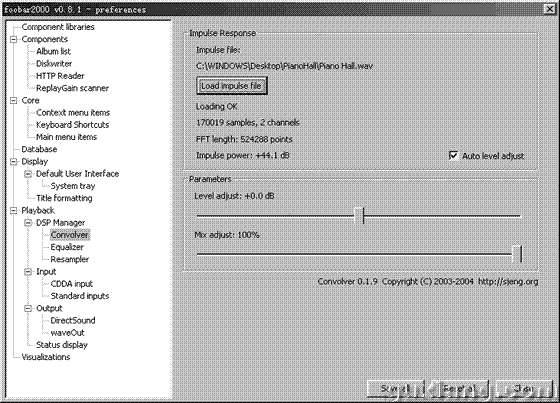 通过第二个滑块Mix adjust(混音调整)可以控制处理过的和未处理过的声音(湿、干)的混合。在foobar2000中,笔者使用的impulse文件是air.wv,再加上平时常用的Resampler(重采样)等DSP功能的作用下,Foorbar呈现出来的声音, 整体表现颇温暖细腻,很有胆机的味道 。总之,配合音乐类型采用不同的脉冲文件就可以享受到高级的音响混音效果了。大家可以试试,说不定也能找到你喜欢的音色。