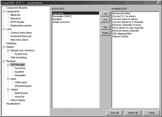 点击工具栏上的“Foobar2000 → Preferences(参数设置)”,在左列设定中选“Playback(回放)→ DSP Manager”。在右边的 Available DSPs(可用的DSP) 清单中选取 Convolver(回旋混响器),将它移到 Active DSPs(当前使用的DSP)内(图1)。