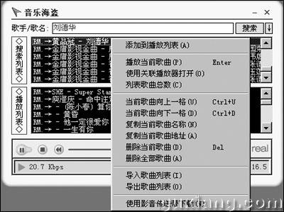 用户只要在软件主界面的上方输入自己所要搜索的文件名称或歌手名称,然后在在线的状态下单击“搜索”按钮,软件即可使用其内置的搜索引擎在全网络对该关键词进行搜索并会将搜索结果导入到软件主界面的“搜索列表”框中。软件支持“.mp3”、“.rm”和“.mpg”音乐文件的搜索,并且用户可以直接在软件的“搜索列表”框中通过双击音乐文件来对搜索到的音乐进行在线试听。如果用户对所搜索的歌曲满意的话,还可以在软件的“搜索列表”框中单击鼠标右键并将选中的音乐文件导入到“网络蚂蚁”或“网际快车”中进行音乐文件的下载。我对软件的搜索功能是非常满意的,通过实际测试,在ADSL上网方式的状态下,通过对“刘德华”这个关键词进行搜索,软件搜索到的歌曲量竟多达上百首(如图所示)。当然了,这中间可能会出现或多或少的“死链”情况,但这种情况并不多,并且只要通过双击能够成功在线试听,下载一般是没有问题的。