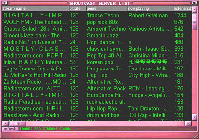 Shoutcast server list控件是一个能够非常方便的选择、收听在线电台的工具,通过右键菜单或点击Thinger中的电台图标进入。界面如图1所示,在电台列表中,会显示每个电台的名称、传送比特率(越高音质越好,相当于MP3的压缩比率)、电台音乐风格分类、正在播放的歌曲、和目前正在收听的人数,双击任何一个电台就可以马上连接并收听了。现在共有300个世界各地的电台在列表中,特别对于宽带用户来说,享受优质清晰的各种音乐资源是越来越方便了。