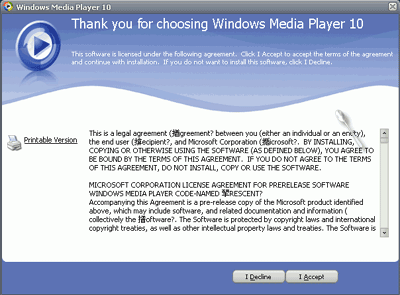 非官方途径拿到了这个奇怪的WMP 10,文字显示是10以外,LOGO、帮助等等都显示的是WMP9,有点夹生的味道,不管怎么样,这个就是所谓的10,正好Realplayer 10也刚刚上市,真可谓“双十对阵”。