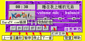 下载好后打开KaraAmp播放器,点击上面的打开按钮来打开刚才下载的伴唱文件,打开这个文件就可以开始唱歌了。(图4)
