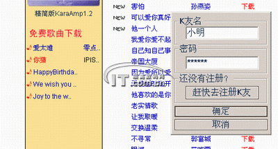 接着就可以去下载卡拉OK伴唱文件来高歌一曲了,伴唱文件很小,一般不超过150KB,大多数伴唱文件是收费下载的,价格很便宜,7元就可以下载10首歌,当然也有免费的伴唱文件提供下载,点击要下载的歌曲后会弹出一个对话框,输入前面注册的用户名和密码就可以下载保存伴唱文件了。(图3)