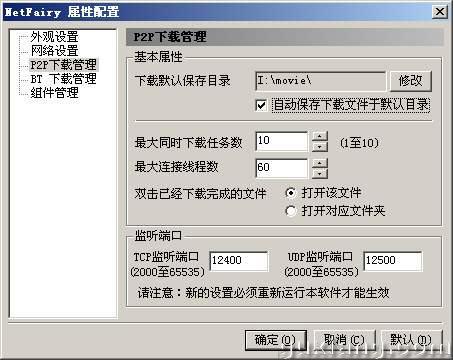 例如,点击“P2P下载管理”后,可设置默认的文件保存位置、最大同时下载的任务数、最大连接线程数,还可以设置TCP端口和UDP端口范围等等(图3)。