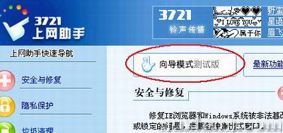 到达3721网站后,我们在首页迅速找到“上网助手”的页面链接,进入上网助手页面,选择“向导模式测试版”,按照提示开始安装上网助手。如图一
