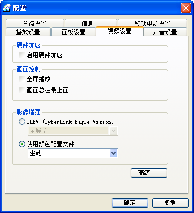 “视频设置”中可以选择是否启用硬件加速,下面的画质控制中可以选择是否全屏播放和在最上面,影像增强中有powerdvd特有的CLEV技术,可以提高画质。
