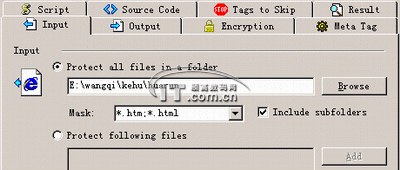 步骤2:首先选择网站所在的目录,在“Input”标签下选择“Protect all files in afolder”,然后单击“Browse”选择网站所在的目录,“Include subfolders”也要选择上,表示对目录中的子文件夹同样起作用(如图1)。