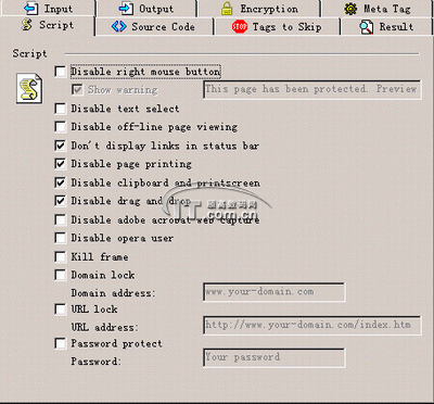 步骤4:选择“Script”标签,这里提供了更多的网站加密功能,有13个之多,几乎涉及到网页中所有需要保护的内容,你可以按需选择(如图2)。
