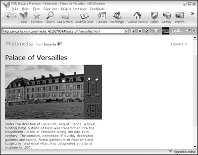 选择一幅你感兴趣的图片,双击后会提示安装“MSN Carpoint Surround Video Control”加载项,同意后会自动完成安装过程,然后我们会看到页面上出现了一幅图片,你可以任意放大或缩小图像,或者在图像上向任意方向拖曳,好像在查看360°全景图,四周的景色尽收眼底(如图2所示),这里提供了缩放、旋转两个滑块供用户调节,看着那美丽的景色,感觉就像在天空中自由飞翔,不知你是否有一种奔放的感觉呢?