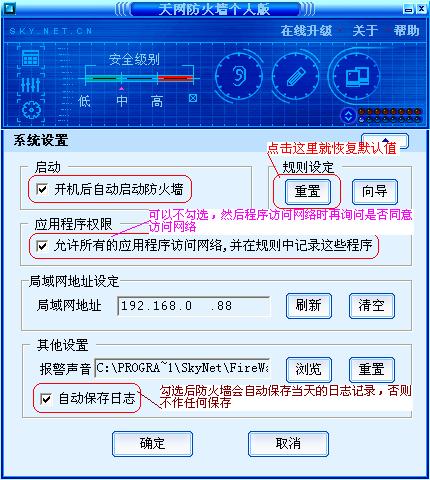 由于天网防火墙有正式版(收费的版本,服务好,功能强)和试用版(免费,用的人很多,高级功能受一些限制)之分,本人支持正版软件,所以这里就以正式版为例给大家介绍,试用版的界面和操作基本都一样,使用试用版的可以参考类似的操作。 安装完后要重起,重起后打开天网防火墙就能起到作用了。默认情况下,它的作用就很强大了。但有时它苛刻的IP规则也带来了很多不便,后面再说。所以,如果没什么特殊要求的,就设置为默认就OK了,安全级别为中就好。 一、普通应用(默认情况) 下面来介绍天网的一些简单设置,如下图一是系统设置界面,大家可以参照来设置: 图一 此主题相关图片如下:
