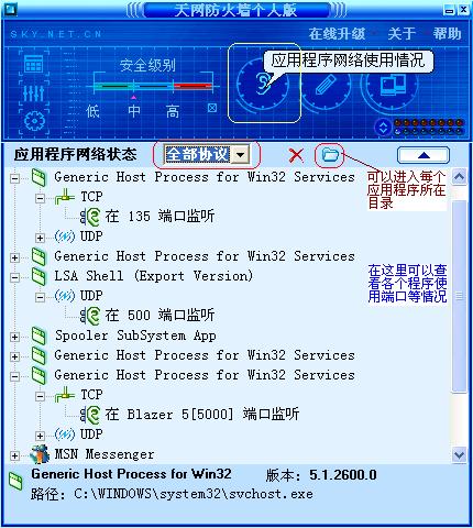 下面是各个程序使用及监听端口的情况,可以查看什么程序使用了端口,使用哪个端口,是不是有可疑程序在使用网络资源,如木马程序,然后可以根据要求再自定义IP规则里封了某些端口以及禁止某些IP访问自己的机子等等。