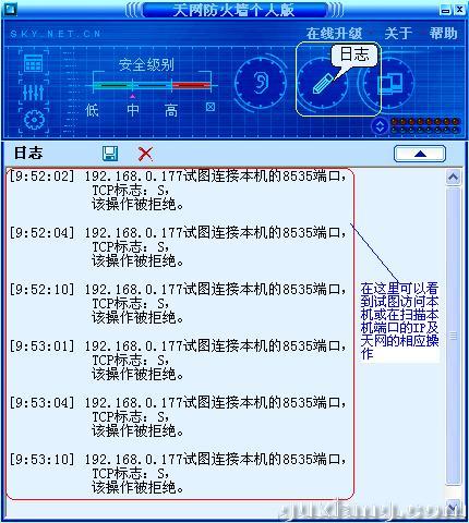 再看下图就是日志,上面记录了你程序访问网络的记录,局域网,和网上被IP扫描你端口的情况,供参考以便采取相应对策,由于是默认就不多说了,日志上基本都是拒绝的操作。 图四 此主题相关图片如下: