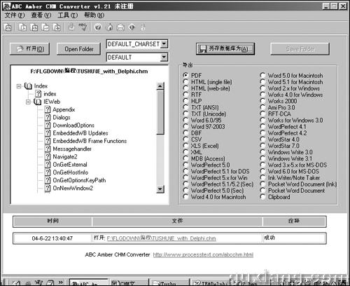 CHM是 Windows下的标准帮助文件格式,也是网上比较流行的电子书格式,通过免费制作工具Microsoft HTML Help Workshop可以十分方便地把HTML格式编译成CHM文件。由于工作需要,笔者想把CHM文件转换成PDF文件格式,一般的方法是先把CHM文件反编译后再用html PDF软件来转换,但这样操作比较麻烦,有没有更方便的方法呢?于是笔者上网搜了一下,发现了名为“ABC Amber CHM Converter”的转换工具可以直接实现转换,现在推荐给大家。 下载安装完毕后,双击桌面的图标启动程序,程序默认的语言是英语,单击“工具→语言”菜单项,在弹出窗口中选择“Chinese simplified”简体中文。单击“打开”按钮,选择要转换CHM文件并打开,CHM文件的目录会显示在左边树形框中(如图1所示),在右边列表中显示可以导出的目标文件格式,在这里选中导出“PDF”项。