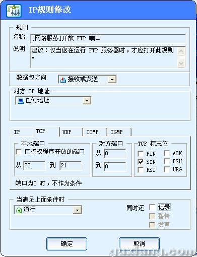 相信不少朋友都使用了FTP服务器软件和WEB服务器,放火墙不仅限制本机访问外部的服务器,也限制外部计算机访问本机。 所以我们为了WEB和FTP服务器能正常使用就得设置防火墙,首先在图八把“禁止所有人连接”前的勾去掉。 以下是WEB和FTP的IP规则供大家参考上图为WEB,下图为FTP。 此主题相关图片如下: