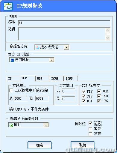 在介绍完新IP规则是怎么建立后,我们就开始举例说明,毕竟例子是最好的说明。大家也许都知道BT使用的端口为6881-6889端口这九个端口,而防火墙的默认设置是不允许访问这些端口的,它只允许BT软件访问网络,所以有时在一定程度上影响了BT下载速度。当然你关了防火墙就没什么影响了,但机器是不是就不安全了?所以下面以打开6881-6889端口举个实例 1)在图五双击后建立一个新的IP规则后在出现的下图七里设置,由于BT使用的是TCP协议,所以就按下图七设置就OK了,点击确定完成新规则的建立,我命名为BT。 图七 此主题相关图片如下: