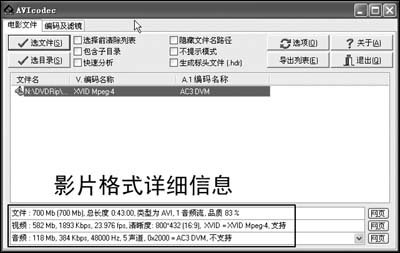 下载、安装并运行该软件后,进入其主界面。在主界面里选择一个需要检测的AVI文件,按“确定”按钮,即可出现了该文件格式的详细信息,包括编码方式、影片品质、档案大小等等(如图),我们从中即可发现不能正常播放影音文件的原因了。