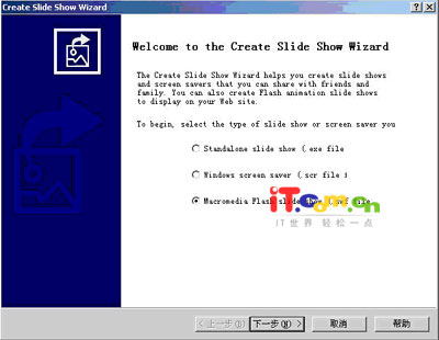 点击主菜单[Create→Create Slide Show…]菜单项可以将图片以幻灯片形式显示的方式制作成flash格式幻灯片文件(图2)。在图2制作向导中选择“Mcromedia Flash Slide show (.swf file)”按照制作向导即可完成。