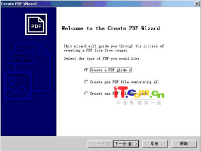 点击主菜单[Create→Create PDF…]菜单项可以将图片以幻灯片形式显示的方式制作成pdf格式幻灯片文件,并可以在Adobe Acrobat中自动播放。生成pdf格式幻灯片文件,它提供了三种方式(图3),Create a PDF slide show: 把你的所有图片制作成幻灯片显示的PDF文件;Create one PDF file containing all images: 把你的所需图片制作成多页显示的PDF文件;Create one PDF file for each image: 把每个图片转换成一个个PDF文件。