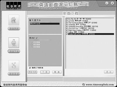 用户打开软件,主界面如图所示。在软件界面左侧单击“歌曲下载”按钮,软件会自动连接到软件服务器下载最新的英语歌曲列表,接下来用户在软件界面右侧的歌曲列表中选中“Edelweiss”这首歌曲(如果用户需要下载其它歌曲,可以一并选中或全部选中),然后单击“下载”按钮,则软件会自动将用户选中的所有英语歌曲快速下载到本地硬盘上(音频文件默认会被下载到软件解压目录的“Download”文件夹中)。