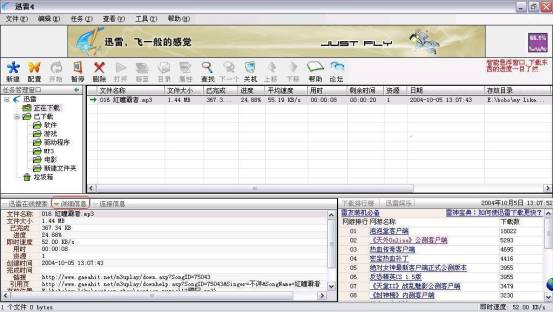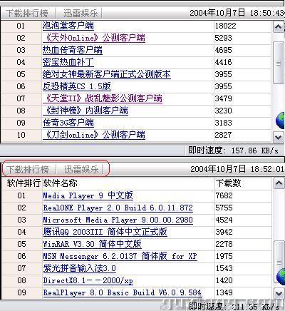 下载排行榜、装机必备: 在迅雷窗口的右下边是最热门的游戏排行榜,可以找喜欢的网络游戏一试身手,下载速度嘛,真的是很快哦。如果下载软件体积小,迅雷并不能显现出它的优越性,以下载天堂Ⅱ为例,文件大小为1.13G,以平均200KB/s速度下载,用时1小时45分。是不是下载得快,相信你用了就知道了。 装机必备也是迅雷的新特色。对于新装机的用户来说,真的是方便至极,无需再到网站上去下载这些软件,在这里你就可以得到,好象就在你的硬盘里一样方便。听歌、看影视,多个软件让你选择,是不是好方便呢,呵呵。