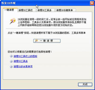(2)清理IE工具栏、IE工具条、清理IE右键菜单。一些程序在IE工具栏上、IE右键菜单上添加了它们的图标,有些我们实际上根本用不上。上网助手提供了清理它们的功能,选择不需要的图标,点击“立即清理”即可。