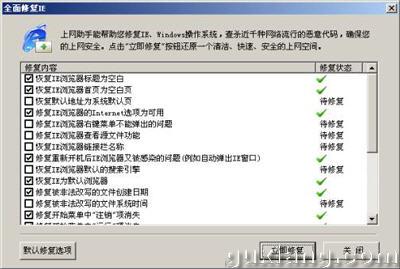 不夸张地说,笔者在无数次和恶意程序的斗争中积累了丰富的经验,自信自己掌握的设置已经足够多,不过当笔者点击工具栏上的“修复IE”-〉“全面修复IE”时,还是被其中的设置吓了一跳,因为其中的设置有多达20项,有个别设置对于即使是笔者这样的老鸟来说也是闻所未闻的。