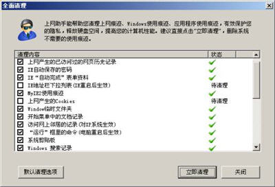 提示:如果你把其中的设置调乱了,只需要简单的点击“默认清理选项”按钮即可恢复原来的设置。