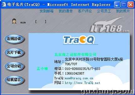 另外,如果您想找拥有TraCQ电子名片的用户,只需在IE浏览器里直接输入http://xxx.tracq.net/其中“xxx”代表用户名或ID号,就可以找到用户的电子名片和网站。这样,用户就在网络推广的同时实现了品牌保护在网上的延伸。同时,新版“网络电话”的推出,也为TraCQ电子名片用户间的商务活动提供了更为便利的沟通途径。