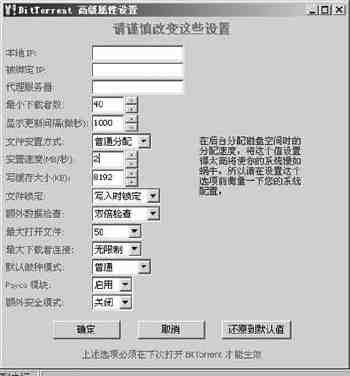 ①如果你是通过代理服务器上网,请填写代理服务器的地址。 ②“文件安置方式”建议直接选用“普通分配”,其意思是随着文件下载的多少而自动调整磁盘空间占用;如果你希望硬盘的磁盘碎片少一些,可以设置为“预分配”,这样在下载之前便完成对文件占用空间的分配。 ③“安置速度”请千万不要设置得太大,否则将会使系统运行十分缓慢,取默认的2MB即可。 ④如果你的内存够大,建议更改“写缓存大小”的默认值到合适,太小的缓存将使系统经常往硬盘中写下载来的数据,你会看到硬盘指示灯闪烁不止,使硬盘长期处于读写状态。有传闻说“BT下载会影响硬盘的寿命”,便是因为此值过小,会使硬盘经常在写数据,全速运转的时间太长,硬盘寿命肯定大受影响。 提示:此值的设置得根据内存大小来决定,因为,该值对应的数字便是在下载过程中用作缓存的内存占用量。 ⑤“Psyco模块”的启用将会使BT下载时降低CPU占用率,从而改善程序运行速度,但是,它同样是要耗用大量的内存的,如果你有256MB以上的物理内存,可以考虑将该项设为“启用”。
