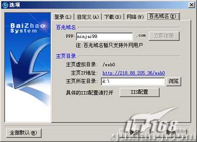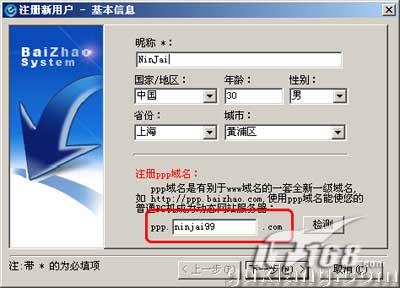 完成百兆的安装后运行,首先点击“注册向导”来注册一个baizhao号码,注意如果你要架设自己的个人网站,那就在“注册PPP域名”栏填写一个域名,填写完毕后单击“检测”看看该域名是否被注册。