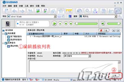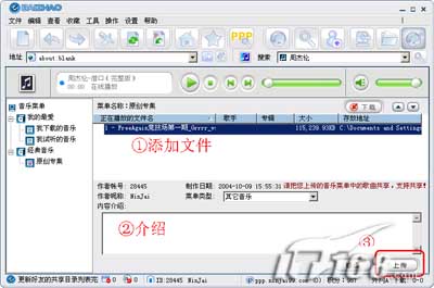 此外,我们还可以上传自己的音乐菜单到服务器,上传的菜单被同时发布到百兆论坛中,网友在浏览到后可以直接与你进行分享。上传方法是切换到“百兆在线多功能播放器”,在“音乐菜单”中选择“原创专集”,再在右边窗口空白处单击右键选择“增加文件”(支持mp3、wma、wmv、ape、ogg等几乎所有格式音乐),并设置添加好各种播放文件,选择一个分类并加上简短的介绍,最后单击“上传”。