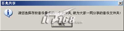 以后登录该号码的方法跟QQ一样,相信不用我多说大家都知道怎么操作了。第一次登录成功后,软件会提示“请您选择存放音乐最多的一个文件夹,做为大家一同分享的音乐文件夹!”我们就选择一个自己存放音乐或者电影等好东东的文件夹吧,网络提倡共享,相信付出总有回报的。