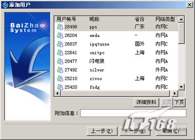 首先我们添加一些好友,添加好友的目的在于可以直接从对方的共享文件夹中获取文件,也方便直接交流分享。添加好友的方法很简单,选择“操作→查找联系人”,我们既可以查找当前在线的随机20位好友,也可以根据对方的百兆号码查找。在搜索结果中的“网络类型”一项,大家可以了解该用户所在网络的状况,大家最好添加公网用户,而非内网用户,这样比较利于文件共享。