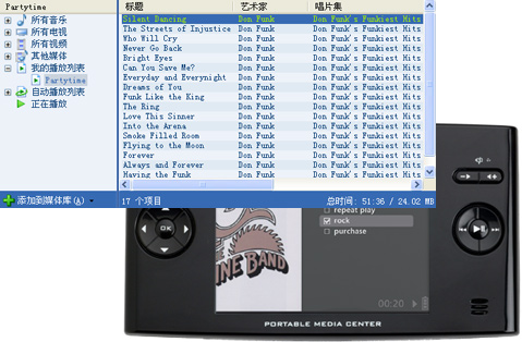 新的音乐订阅服务允许您按月付费并下载您想要的所有音乐。使用 Windows Media Player 10,您现在可以将这些歌曲存放到新一代的便携式设备上以便随身携带。您现在可以通过注册 Napster Mobile 订阅服务,并将所下载的音乐同步到基于 Windows Mobile 的 Portable Media Center 设备中,来尝试这种体验。今年秋天的晚些时候将会提供更多支持订阅内容的设备。 四、智能自动唱片点唱机功能