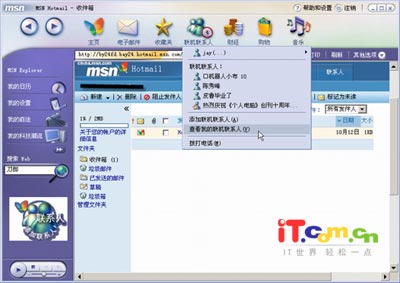 聊天工具 在MSN Explorer中还集成了微软的聊天软件——MSN Messenger,只要点击MSN Explorer工具栏中的“联机联系人”工具按钮就会显示一个菜单选项,我们可以通过这个菜单来选择自己的MSN状态、查看和添加联系人等操作。如果点击了菜单中的“查看我的联机联系人”,那就会打开MSN Messenger的软件界面,这样我们就可以与在线的好友进行网上聊天、网络电话等操作。(图4)