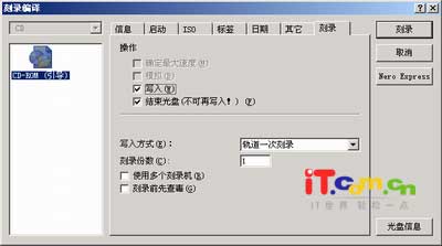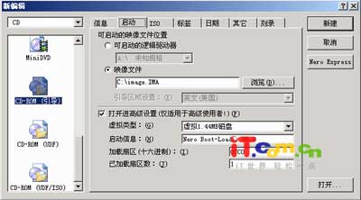 小提示:如果我们要为生成的映像文件加密,那么可以在“另存为”窗口中单击“Password”按钮,在打开的对话框中设置保存密码。判断是否设置口令的方法是在WinImage主界面上查看右下角,如果有一个黄色的小锁图标,那么就表示已经加密了。 现在我们就可以启动Nero Burning Rom来制作这张启动盘了。首先用U盘等设备将制作的IMA文件拷贝到我们安装刻录机的那台计算机上,同时启动Nero,单击打开“文件”菜单,选择“新建”命令,在打开的“新编辑”窗口左侧选择“CD-ROM(引导)”项,同时将右侧的选项卡切换到“启动”项,然后在“可启动的映像文件位置”处选中“映像文件”选项,并单击“浏览”按钮,将使用WinImage制作好的映像文件添加进来,接着再选中“打开进高级设置(仅适用于高级使用者!)”选项(如图6),其它的参数都可以保持默认设置。设置完毕单击右上角的“新建”按钮,在出现的Nero主界面中的文件浏览器窗口里拖动要刻录的其它文件和文件夹到左侧的ISO1窗口中,最后打开“刻录器”菜单,选择“刻录编译”命令打开刻录编译窗口,设置好标签、日期等信息后,单击右上角的“刻录”按钮开始刻录(如图7)。