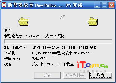 对于搜索到的文件,点击可以进行P2P下载,按道理采用P2P下载,其速度应该是很快的,但笔者经几次试用,下载速度并不是很理想,其速度只有几K最快也就是几十K(如图7),下载速度好像又回到了用小猫下载的时代。