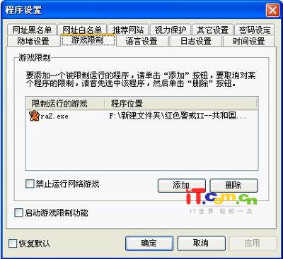 3、 限制游戏 网络爸爸可以通过软件设置来限制孩子玩游戏,只要把要限制的游戏名称添加到受限名单里,孩子就不能玩受限的游戏了(如图6)。同时可以设置不让孩子玩网络游戏,只要选中“禁止运行网络游戏”前面的小方框就可以了,设置以后,可要记的把下面的那个“启动游戏限制功能”前的小方框也要对上对号呀,不然是不会起做用的。