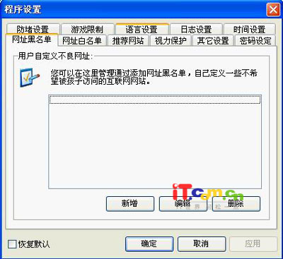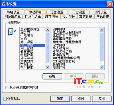 6、 推荐精彩网址 好的网站可以引导孩子向正确的道路发展,我们可以在空闲的时候,给孩子找一个好的网站,推荐给他们,在软件设置的推荐网址里面可以设置要推荐给孩子的网址(如图9),如果担心网络爸爸对孩子上网“照顾不周”的话,可以选中“只允许浏览推荐网站”,这样孩子在上网的时候,就只能浏览推荐的网址。