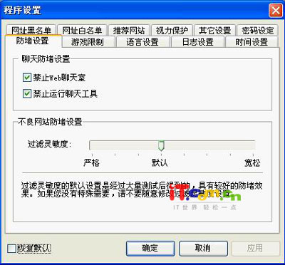 2、 限制聊天 我们可以说是孩子最喜爱的上网方式之一了,网络爸爸可以限制孩子进入WEB聊天室与限制使用QQ、MSN、UC等聊天工具(如图5),同时还通过设置灵敏度的方法来防堵网站,灵敏度设置的越高,则防堵的就越历害,不过如没有特殊需要,请不要随便更改灵敏度的设置,因为灵敏长的设置是经过大量测试得到的,如更改了,可能会影响正常网页的游览。