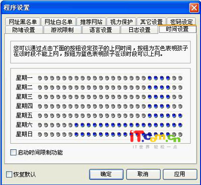 4、 控制上网时间 网络爸爸通过设置每天的上网时间段来限制孩子上网的(如图7),只有每天的小灯泡是蓝色的时段里,孩子才可以上网。同时网络爸爸可以与世界上30多个时间标准服务器进行连通,与你的本地时间进行校对,如果你更改了本地时间,只要能连上网络,网络爸爸就会自动更改你的本地时间为标准时间。