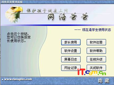 当然了我们也可以通过设置把系统托盘的图标去除,双击系统托盘的图标,输入密码后(软件默认密码为空),软件主界面就出现在我们的面前了(如图2),在这里我们可以设置是家长使用还是孩子使用,同时也可以方便的查看网址记录与屏幕录像,还可以对程序进行系统设置。