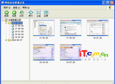 8、 屏幕录像 只是查看网址有时候过于麻烦,我们也可以查看上网时的屏幕截图(如图11),在这里可以清楚的看到孩子上网时的屏幕截图及时间,与查看上网记录一样,只要点击系统托盘的图标再选择查看屏幕截图就可以了。